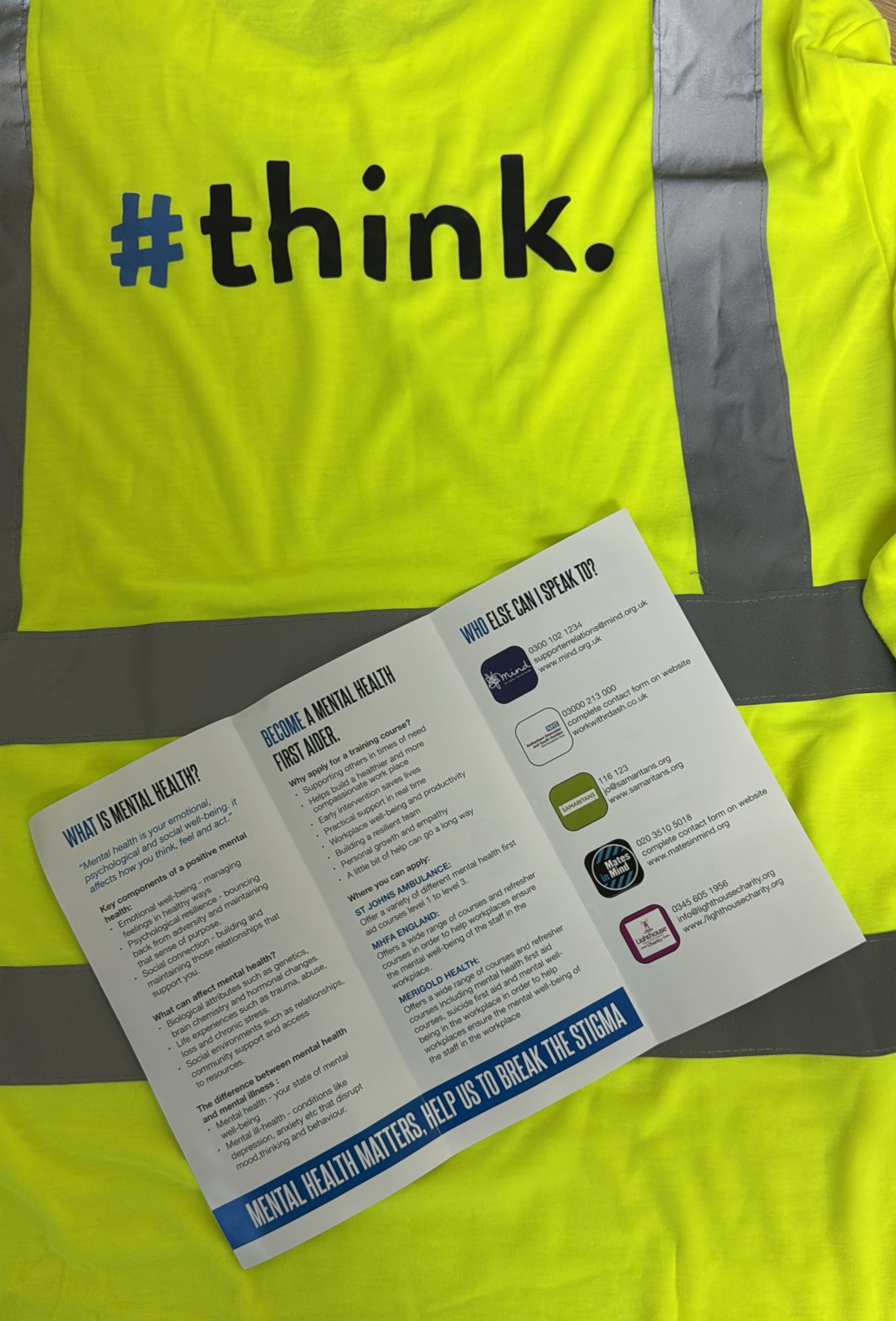The leaflet also included a range of external support services from Mind (0300 102 1234) and Samaritans (116 123), to industry-specific organisations like Mates in Mind and the Lighthouse Construction Industry Charity, giving workers multiple routes to support, anonymously if they preferred.