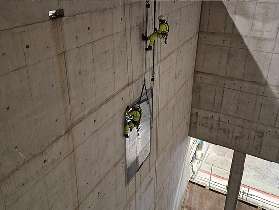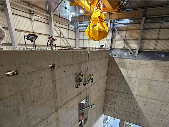 The process involved four rope access technicians, two of whom were qualified riggers. They manoeuvred each section from the laydown area of the 20m level within the waste bunker over the bunker wall and into its final fixed position. Utilising the skill set of the riggers, obstacles were overcome using standard rigging made accessible through rope access.