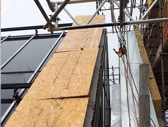 Working closely with our temporary works engineers our teams were able to build scaffold structures capable of suspending themselves from whilst mini cranes were utilised to lower the large panels into place.