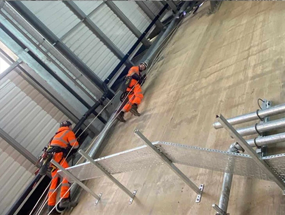 Turbine Hall: The team installed the primary pipework and sprinkler heads, utilising rope access techniques to efficiently navigate the complex structural layout.