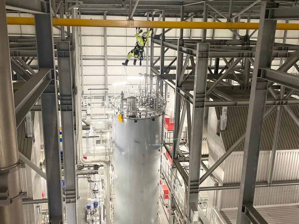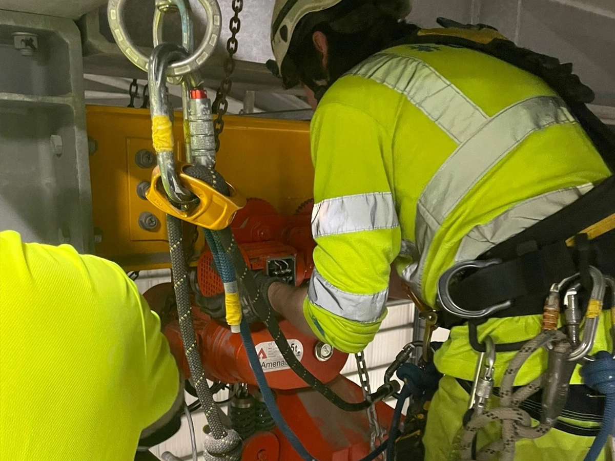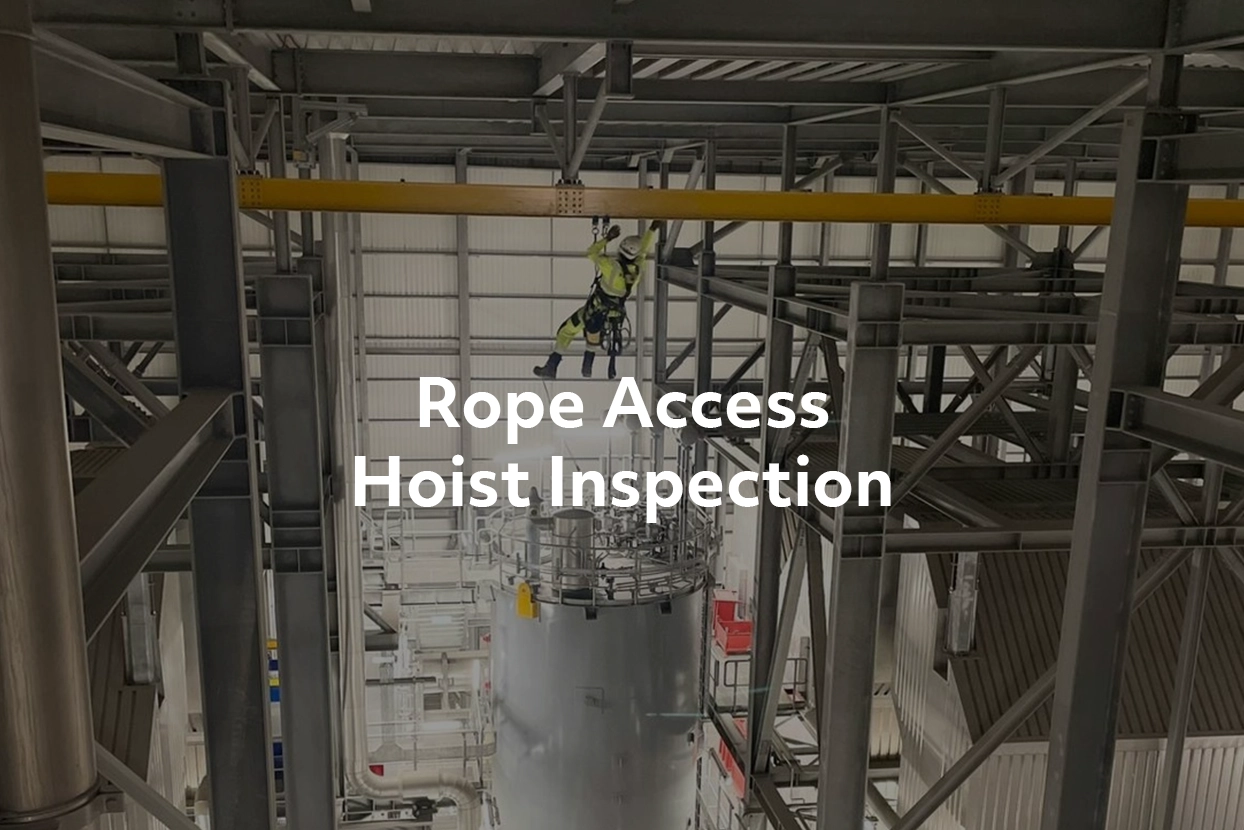A sub-contractor required specialist rope access support to assist with inspection and motor replacement works on an installed monorail and bus bar hoist system at a large energy recovery facility. Standard means of access were not achievable given the height and location of the hoist within the boiler hall. Think Access was appointed to provide IRATA-certified rope access technicians to safely position operatives along the monorail beam, facilitate close inspection of the system and support the hoist manufacturer’s representative throughout the works.