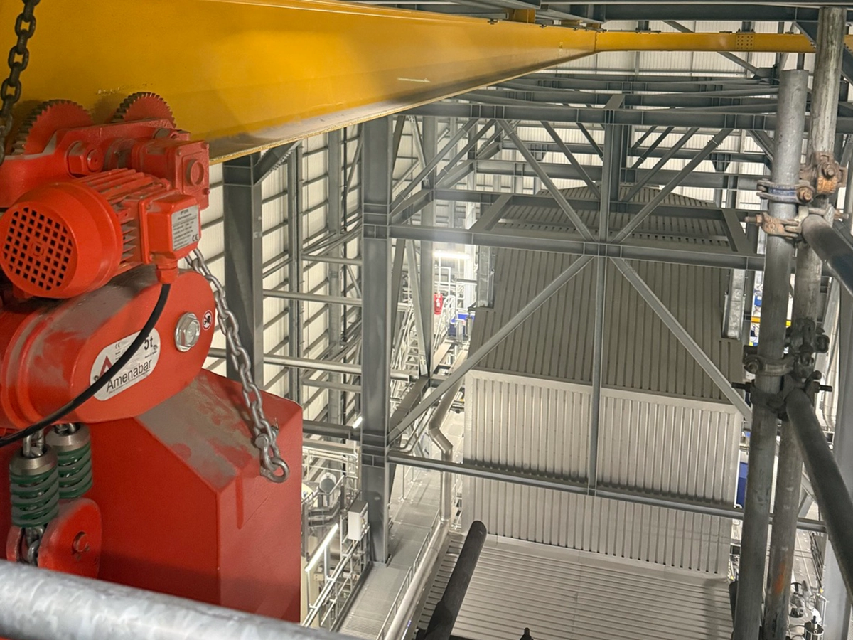 The hoist system was located at significant height within the boiler hall, with the working area accessible only by travelling over 70 metres along a yellow overhead beam. No conventional access platform could reach the inspection zone safely. This made rope access not just the practical option, but the only viable one.