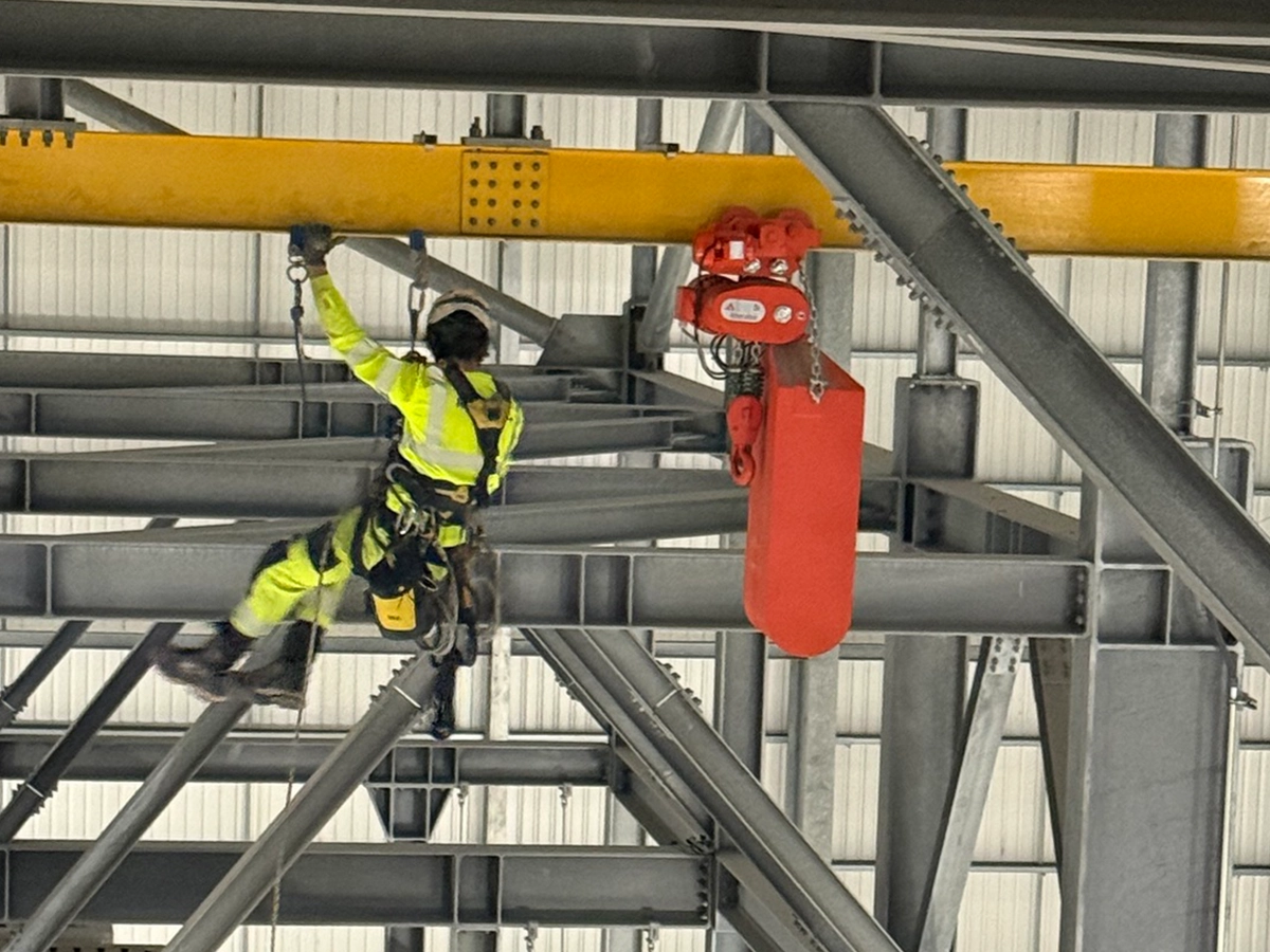 Anchors were attached only to primary structural steel, not to the monorail track itself, with the rope access supervisor verifying suitability before any loading was applied. No dynamic loading was applied to the monorail beam during any part of the works. All tools and equipment were tethered in line with Think Access dropped object controls. Exclusion zones were maintained below the working area throughout.