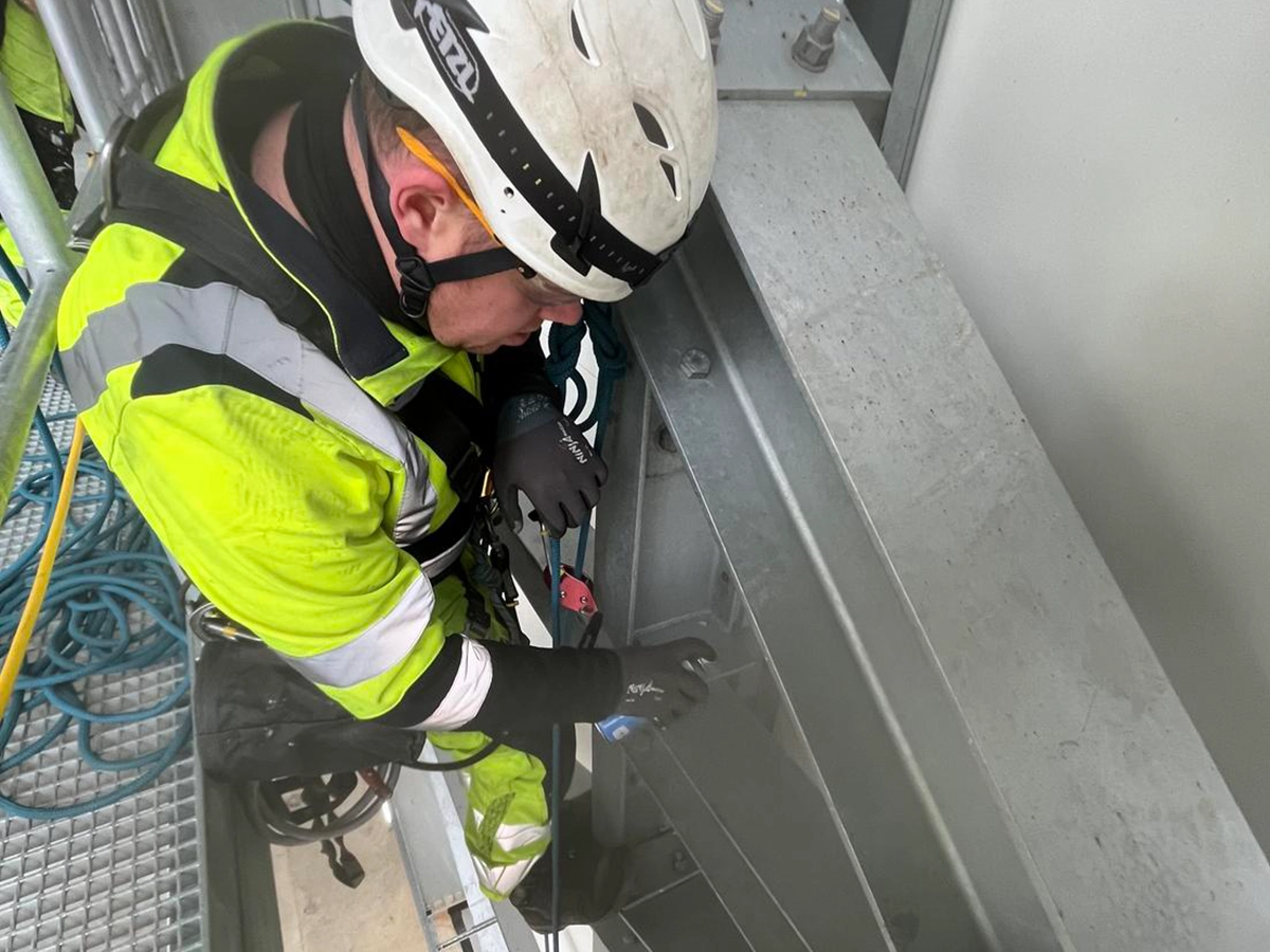 Think Access deployed IRATA-qualified rope access technicians to the site, completing all inductions and permit sign-ons before starting work each day. On the initial mobilisation, the team set up 110v power supply for a shear gun and proceeded to torque bolts across the steel connection lines in the waste bunker, working systematically through the connection sequence.
