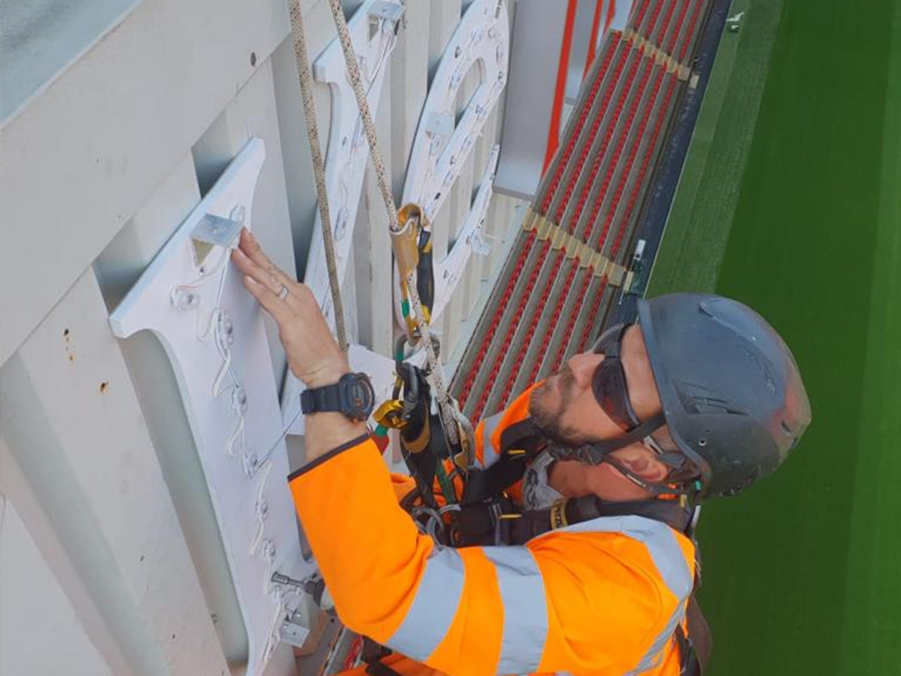 Due to the re-naming of the old ‘Centenary Stand’ to the ‘Kenny Dalglish Stand’ in honour of the former player and manager our technicians were employed by the signage company to assist with the installation of the new sign via Rope Access.