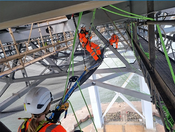 The underside of the bridge consists of a dense lattice of angled steelwork. Each clamp, chain, and net panel required precise alignment to ensure even load distribution. The modular design of V-Deck allowed operatives to position themselves exactly where required, making the installation of beam clamps and stitching nets far more efficient than if rope access alone had been used.