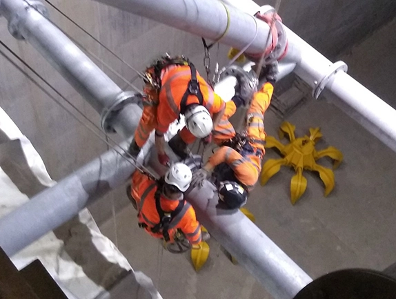 Being installed once the structure was almost complete meant bringing in the ‘halo’ from below and lifting to position with the overhead crane. #thinkaccess Rope Access technicians then accessed the area to bolt the steelwork to the bunker wall.