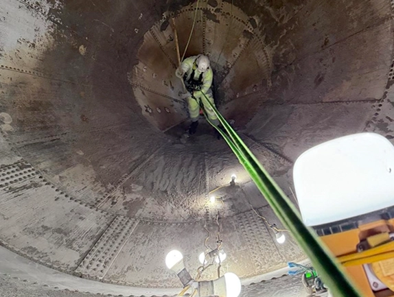 - Confined vertical access: The internal structure of the gasifier required rope access operatives to enter from above and work in suspended positions.