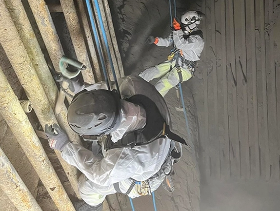 Once access systems were in place, the rope access crews began the removal of internal build-up. Refractory and slag material was detached from the gasifier walls using a combination of hand tools and pneumatic breakers. The waste was managed and cleared through coordinated handovers with plant personnel.