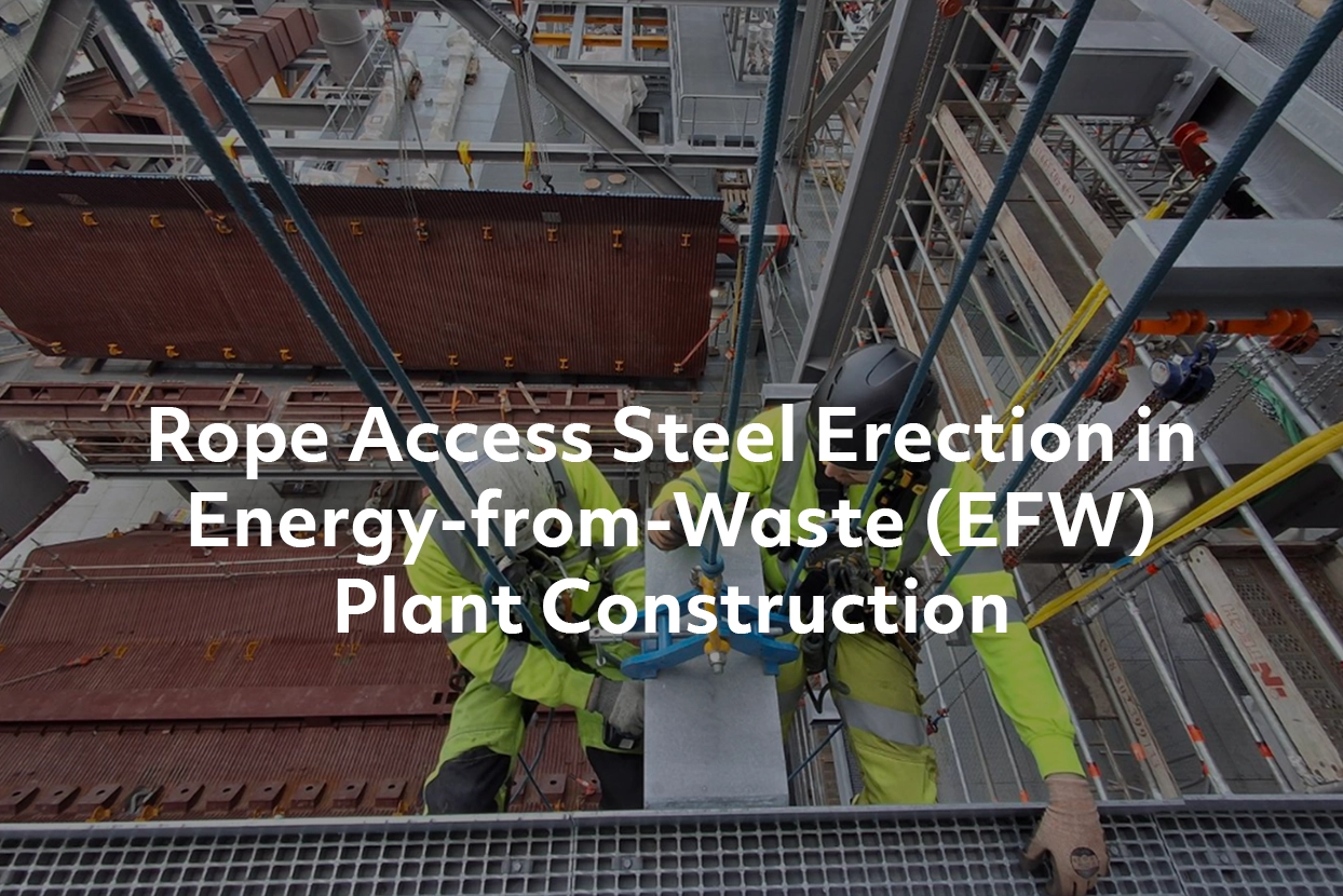 Traditionally, large industrial structures, such as EFW plants, rely on conventional crane and MEWPs for steel erection. However, the project’s constraints—particularly the limited access space and challenging weather conditions—called for a different approach. As a solution, a team of rope access-trained steel erectors was deployed to manage the structural assembly work. This innovative approach has proven highly effective, allowing the project team to meet strict deadlines while maintaining exceptional safety and quality standards.